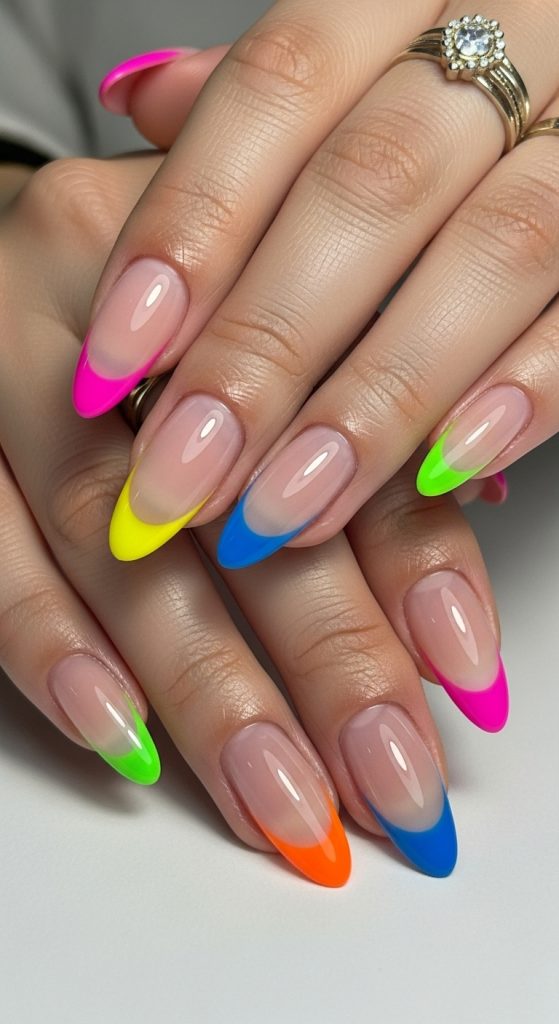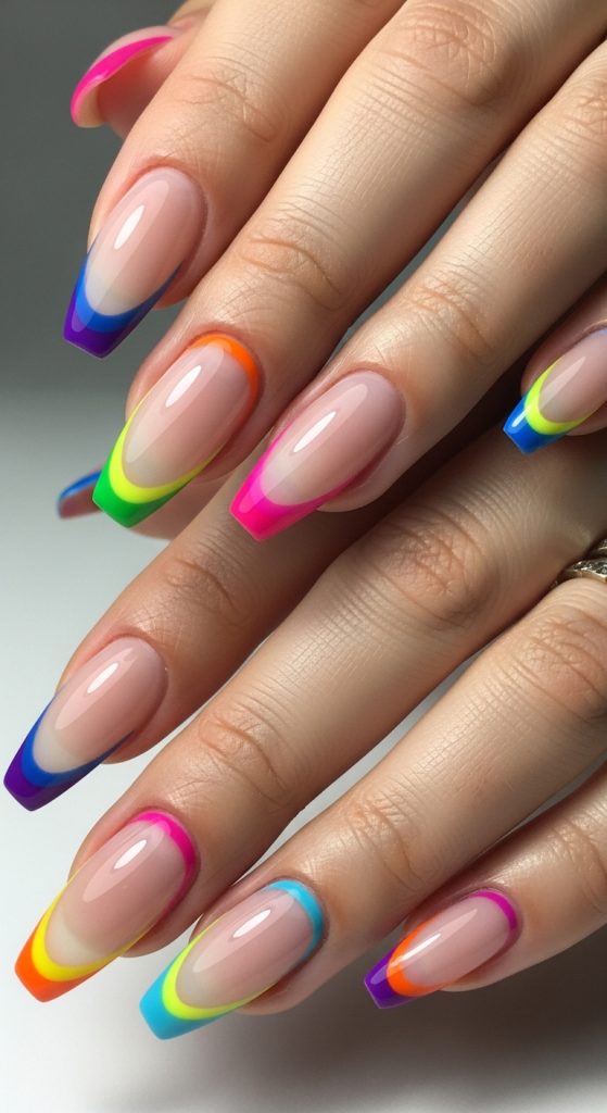 French tip outlines in rainbow colors instead of solid tips, giving a graphic, airy design.