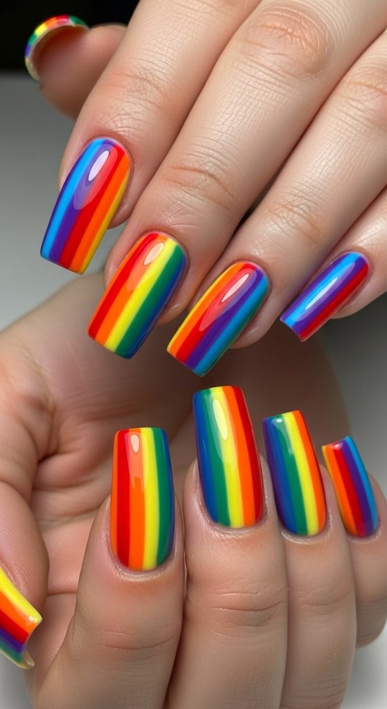 Horizontal or vertical rainbow stripes on each nail using red, orange, yellow, green, blue, and purple.