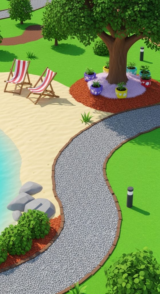 - Use terrain or parts to simulate gravel paths, mulch beds, or sandy beaches