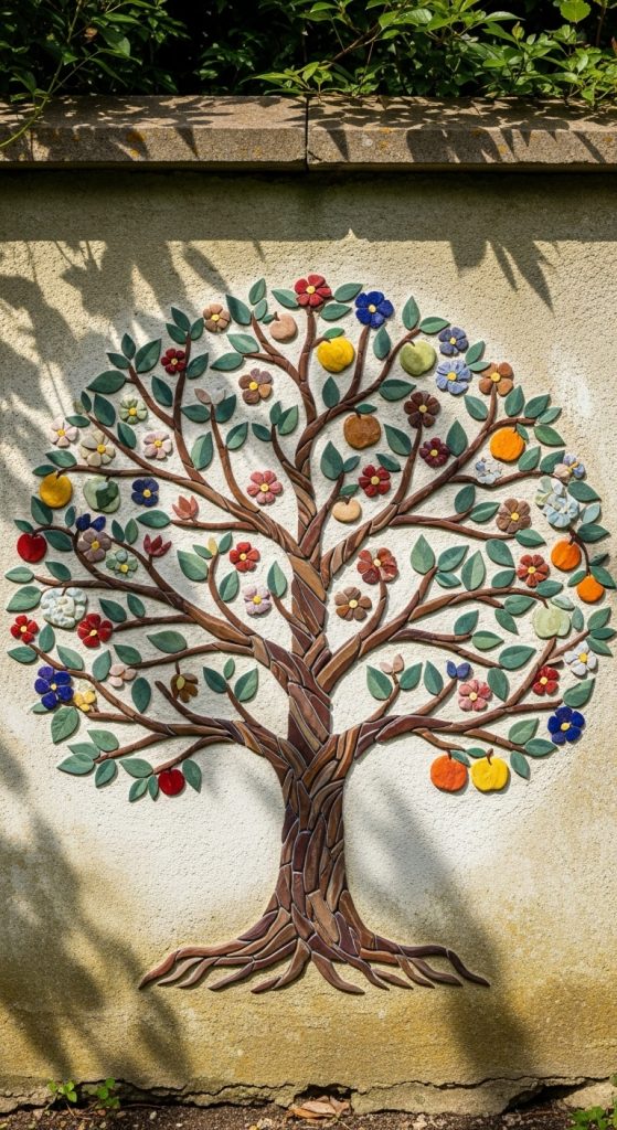 Use flat pebbles and stones to create a Tree of Life design on a garden wall or fence. The organic shapes blend beautifully into the natural surroundings.