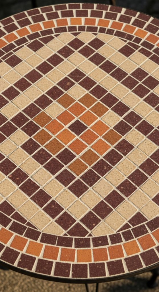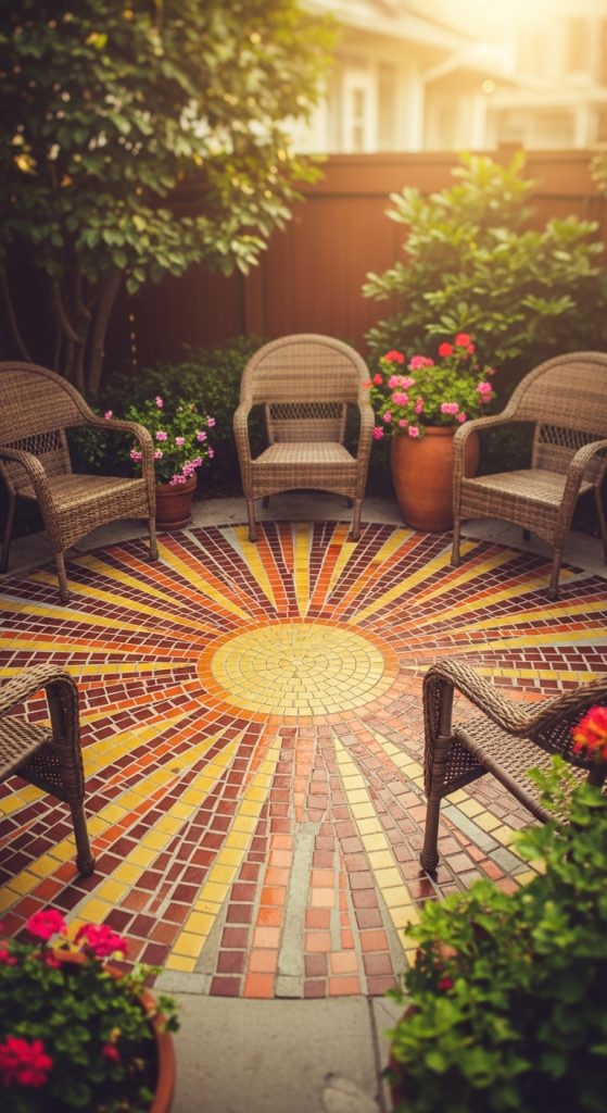 Design a mosaic sunburst with warm-toned stones and tiles as the center of a small patio. This makes a cozy sitting area that feels artistic and welcoming.