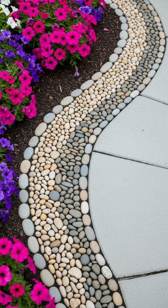 Design a narrow pebble mosaic border along flower beds or garden paths. Even a simple stripe or zigzag adds texture and polish.