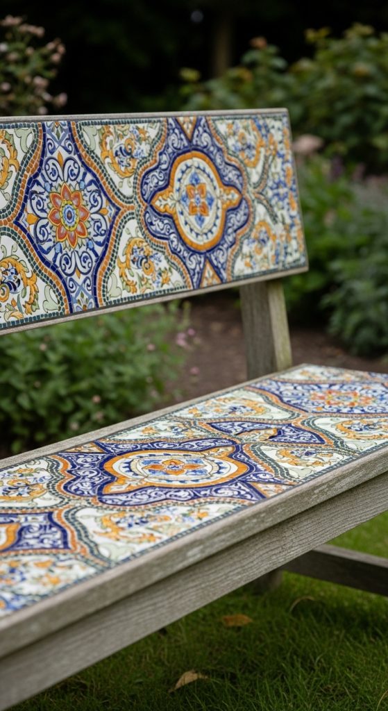 Transform a plain garden bench by adding a seat or backrest mosaic made of broken tiles, glass pieces, and stones in colorful patterns.