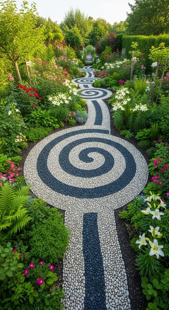Create a swirling spiral pattern on a garden path using pebbles of different colors. This design draws the eye forward and makes even a simple walkway feel special.