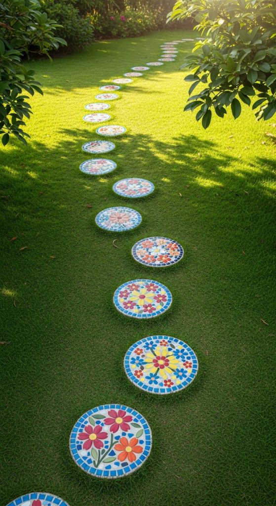 Make stepping stones with mosaic flowers at the center, crafted from colorful glass pieces, pebbles, or small tiles. These add charm and color to garden paths.