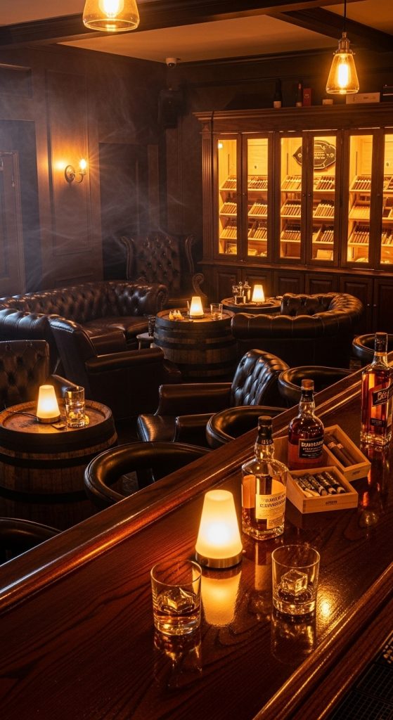 • Features: Dark wood bar, leather club chairs, vintage whiskey barrels, soft golden lighting.
