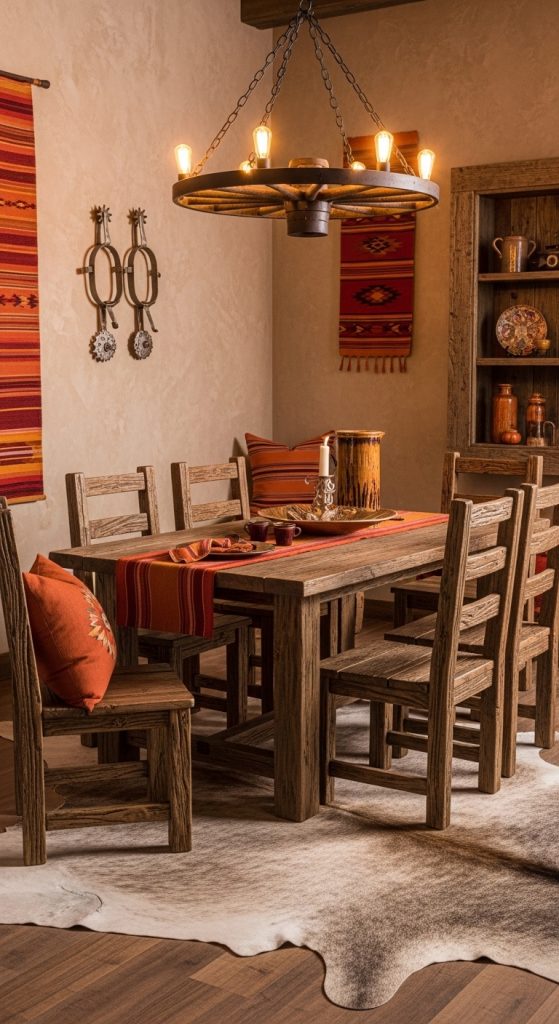 • Features: Cowhide rugs, wagon wheel chandelier, weathered wood furniture, antique spurs.