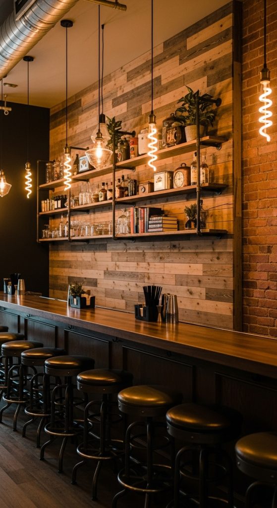 • Features: Reclaimed wood panels, black iron piping, Edison bulb lighting, vintage signage.