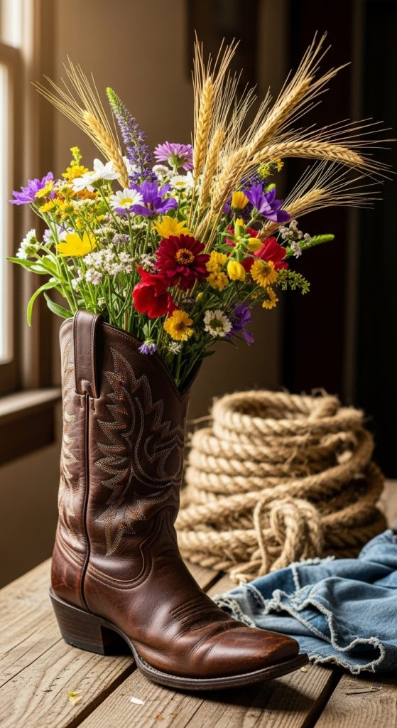 - Clean an old cowboy boot and insert a vase or jar inside