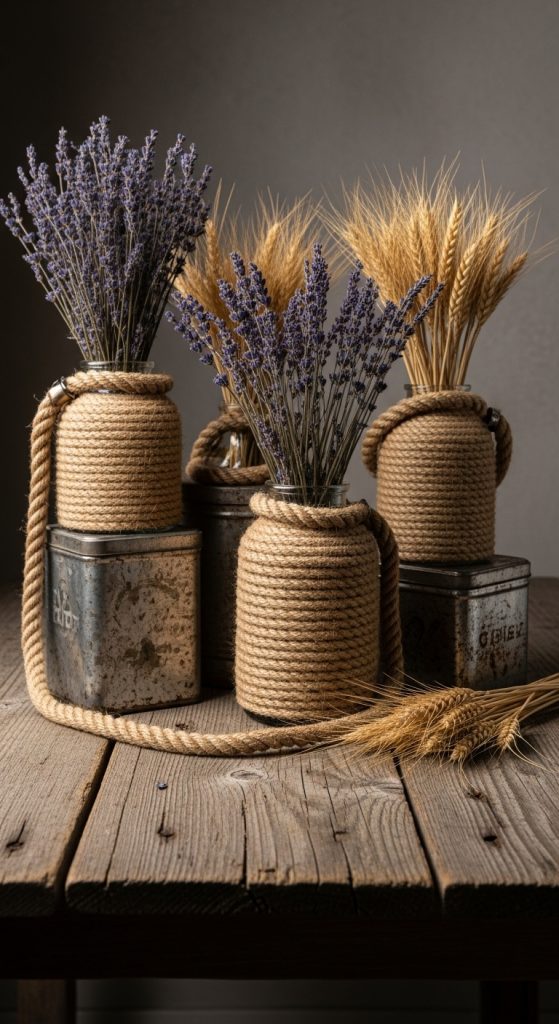 - Wrap thick jute rope around a glass vase or tin can