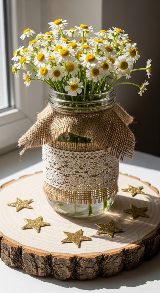 - Place a mason jar filled with sunflowers or daisies on top